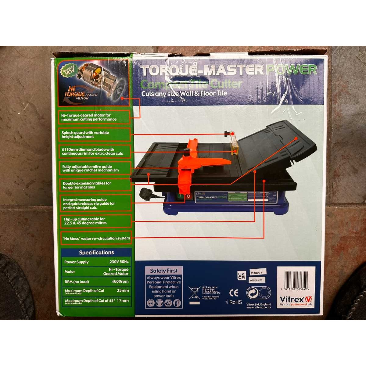 450W AC powered tabletop tile cutter with a 4600rpm motor and 110mm diamond blade. Max depth of cut is 25mm (17mm if using 45 degree mitre). Mitre cutting angles are 22.5 and 45 degrees, flat cutting angles from 0-45 degrees. Includes adjustable rip guide, variable angle mitre guide, blade spanner and safety/operating manual.