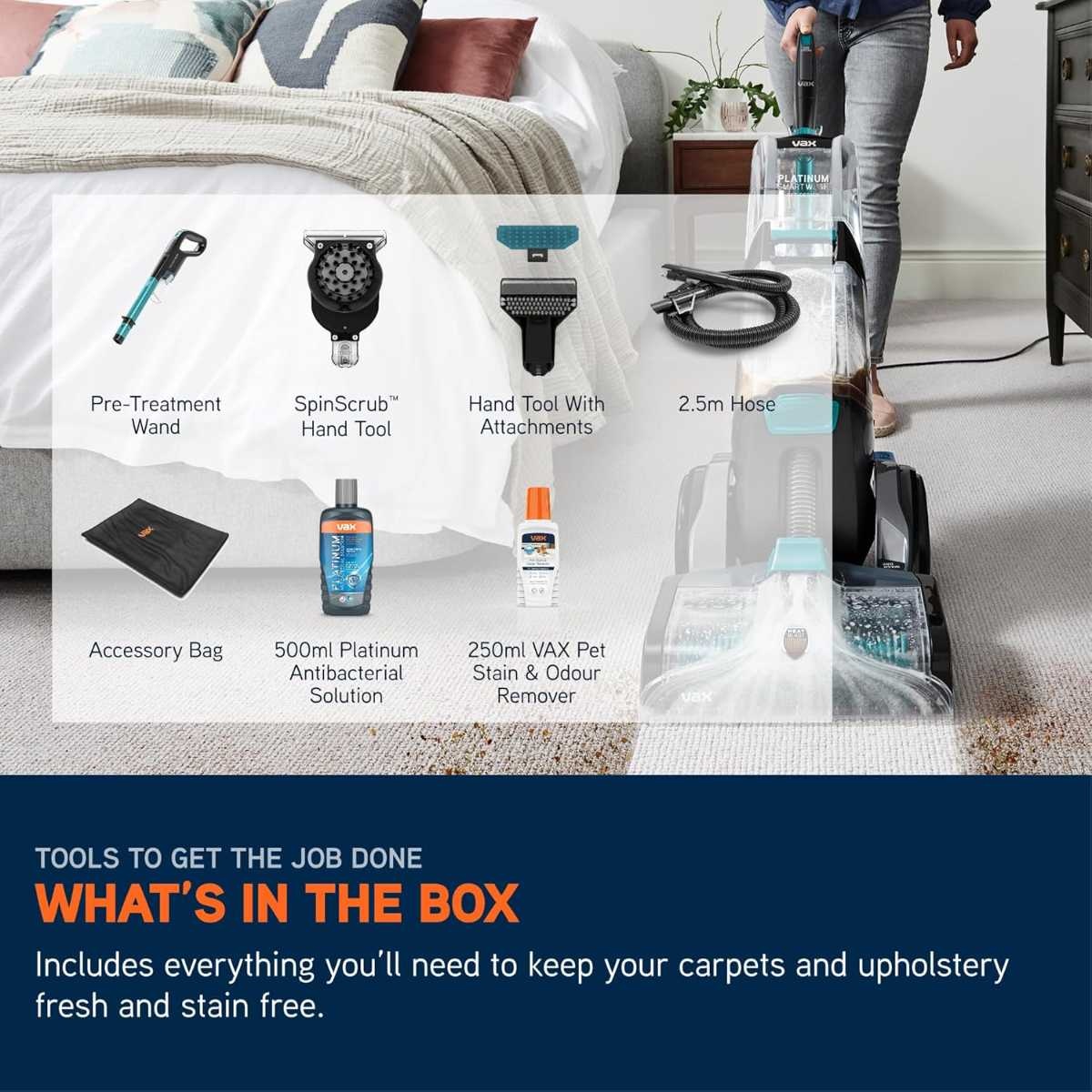 VAX Platinum Smartwash designed for cleaning carpets, including accessories for stain removal. Triggerless design.