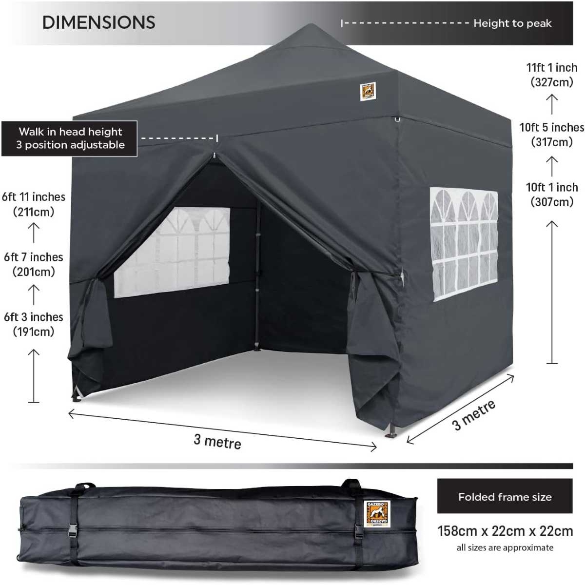 Black 3m pop-up gazebo with 4 attachable sides (2 with windows). Complete with carry bag and accessories.